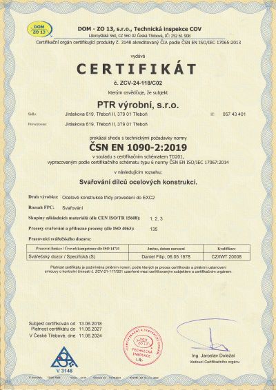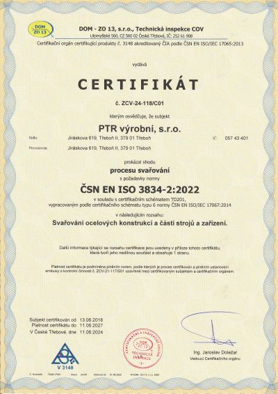 Svářeči splňují EN 287-1. Podnik splňuje podmínky pro výrobu kovových stavebních konstrukcí podle ČSN EN 1090-2. Proces sváření probíhá dle normy ČSN EN ISO 3834-2.