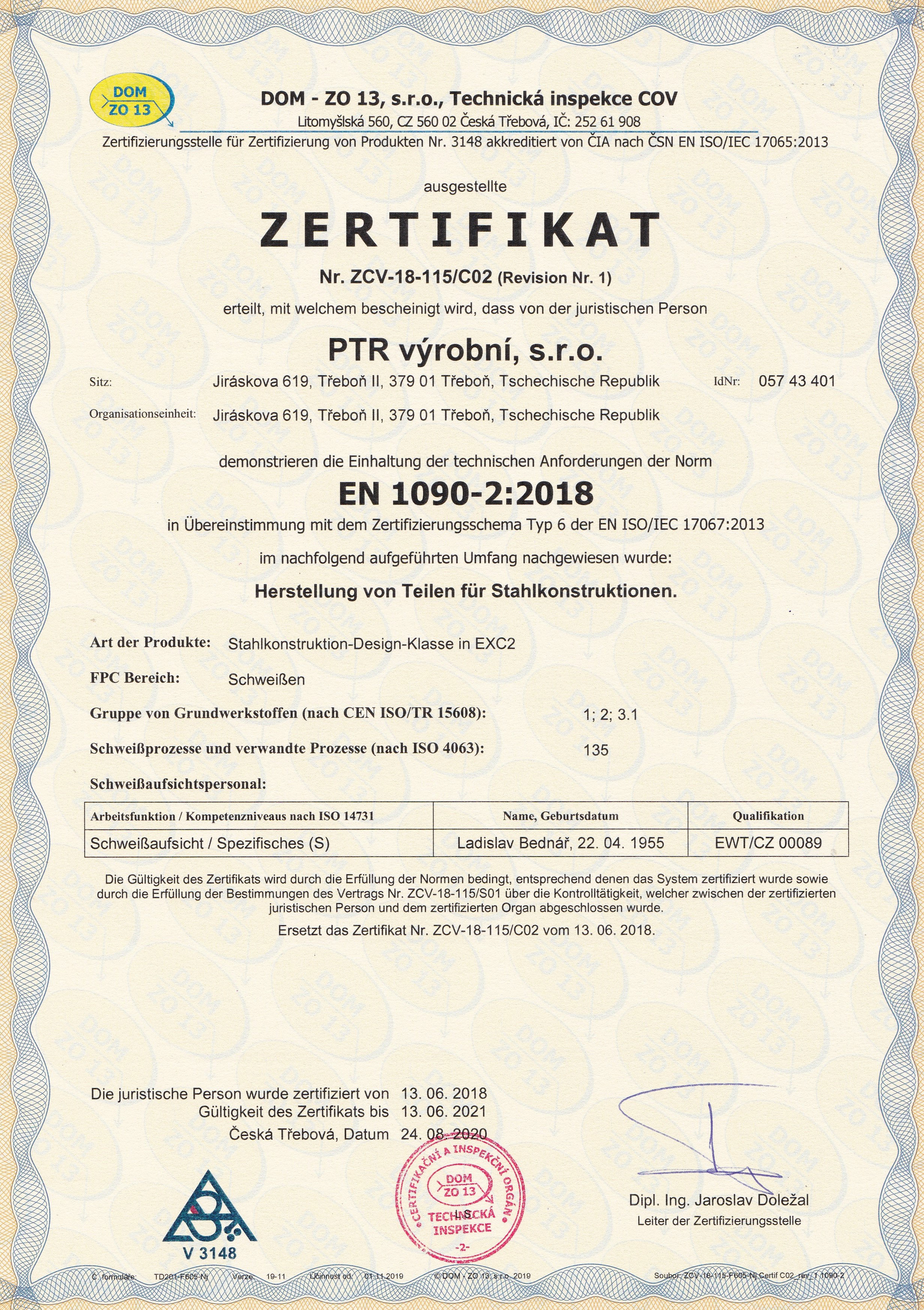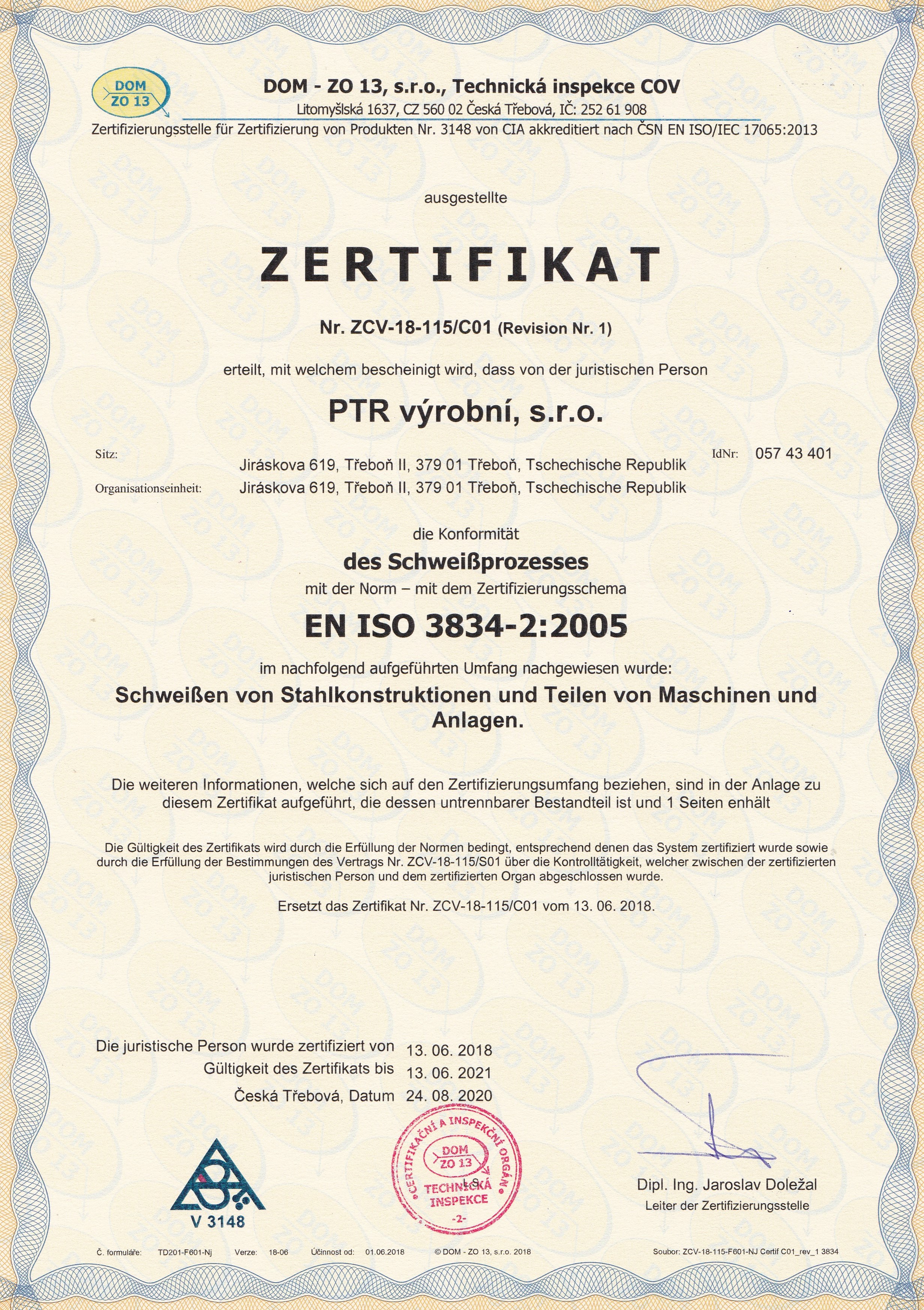 Werkszertifizierung für Schweissen laut den Normen ČSN EN 1090-2 und EN ISO 3834 erfüllen wir seit 14.06.2014